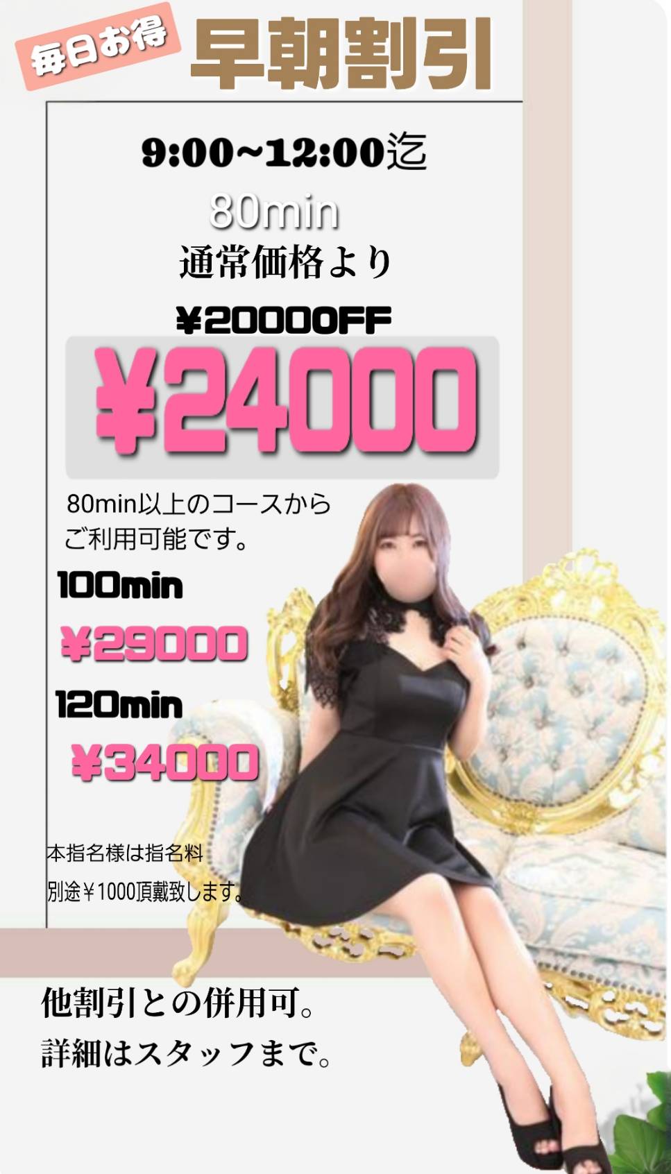 最新ニュース 次へ > 3/24 09:00 毎日お得な本陣の早朝割☀ シャトー本陣お得な~早朝☀割引~ 。*゜*。,。*゜*。,。*゜*。,。*゜*。,。*゜*。,。*゜*。AM9:00~12:00迄通常価格 ¥26000↓早朝割で¥2000引きの ¥24000本指名様のみ指名料別途¥1000頂戴いたします。。*゜*。,。*゜*。,。*゜*。,。*゜*。,。*゜*。,。*゜*。 【girlscheck】【blog】 次へ >